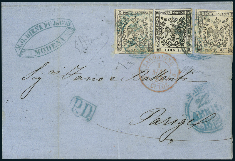 1852-53, lettera da Modena del 27 aprile 1858 per Parigi, affrancata con due esemplari del 25 c. camoscio chiaro (4) ed 1 l. bianco (11), annullati con bollo a cappello in azzurro, con due francobolli dell’affrancatura anche obliterati con il timbro rosso di entrata in Francia. Affrancatura molto rara comprendente il raro uso di 1 lira su lettera per la Francia. Cert. Enzo Diena, firmato A. Diena per esteso.