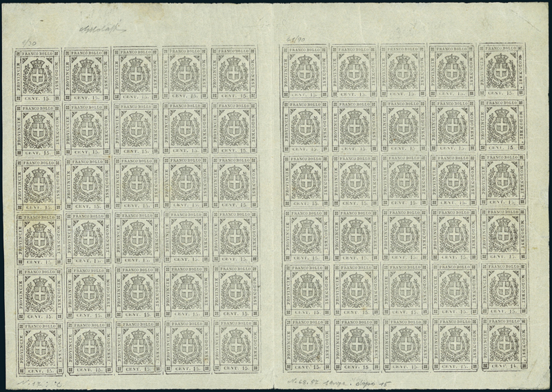 1859, 15 c. grigio (14), non emesso, due quarti superiori della composizione del foglio di 120 esemplari, recante il punto in alto prima della ''C'' nella posizione 17, come pure le posizioni 68 e 87 con la varietà ''senza punto dopo le cifre''. Eccezionale e freschissimo, con gomma originale integra. Firmato G. Bolaffi e Fiecchi.