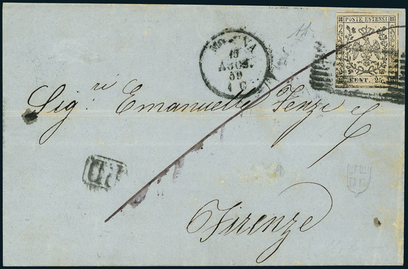 1859, lettera da Modena del 15 agosto 1859 per Firenze, affrancata con 25 c. camoscio chiaro, annullato con bollo a nove sbarre con lo stemma di Savoia (A4). Affrancatura singola interessante in periodo provvisorio. Firmato A. Diena.