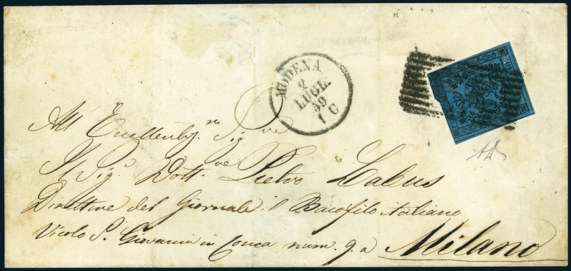 1859, lettera da Modena del 2 luglio per Milano, recante un 40 c. azzurro scuro, annullato con bollo a nove sbarre con lo stemma Sabaudo (A10), con arrivo al verso. Firmato A. Diena.