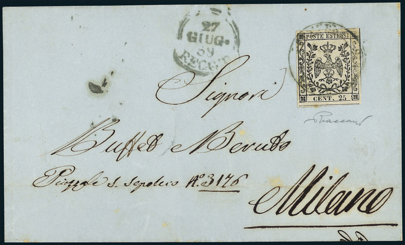 1852, lettera da Reggio del 27 giugno 1859 per Milano, con affrancature singola del 25 c. camoscio chiaro, annullato con il risorgimentale ''Posta Lettere Reggio'' (B4) con stemma sabaudo. Cert. Vaccari.