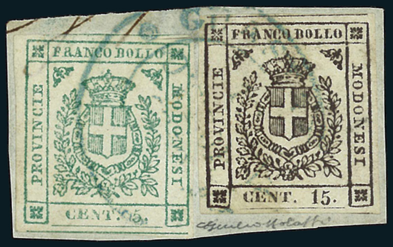 1859, 5 c. verde (12) e 15 c. (13) del Governo Provvisorio, entrambi ben marginati e annullati, su frammento, con bollo in azzurro-verdastro di Guastalla. Molto raro. Cert. Vaccari, firmato Em. Diena, G. ed A. Bolaffi.