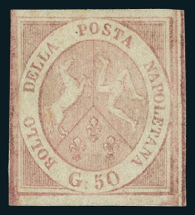1858. 50 gr. rosa brunastro (14), molto fresco, recante margini grandi e bilanciati, con gomma piena originale con traccia di linguella. Un esemplare splendido di questo raro francobollo. Cert. A. Bolaffi, firmato Oliva.