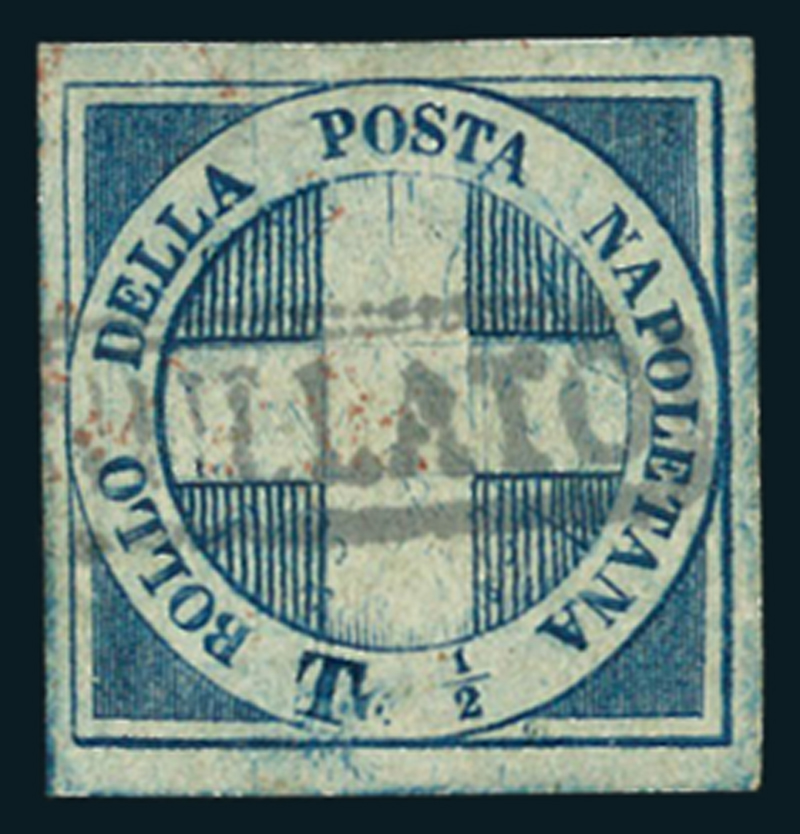 1860, 1/2 t. azzurro (16), margini ampi e bilanciati, recante parte del bollo "Annullato" in cartella, con tracce di un altro timbro in rosso. Molto bello. Cert. Fiecchi e Robineau.