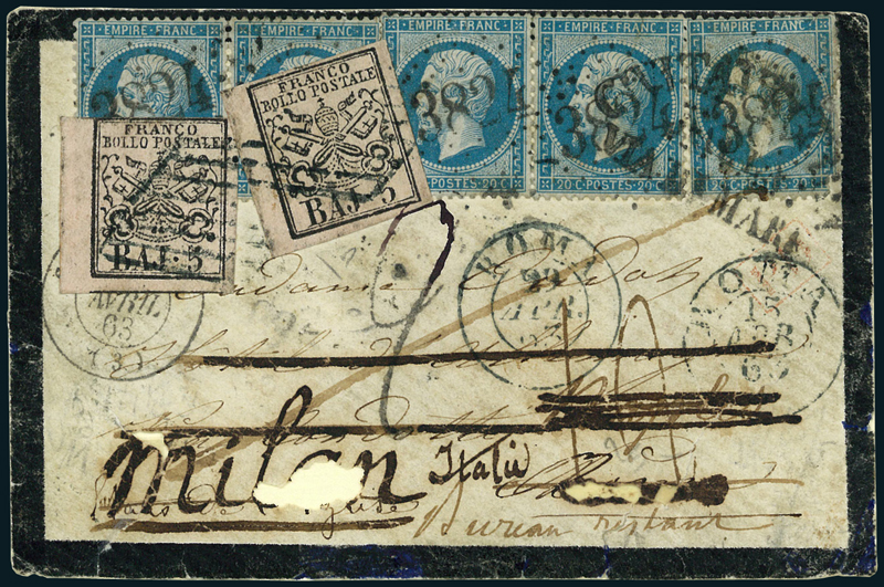 1852, frontespizio di lettera da St. Pourçain (Francia) dell'aprile 1863 per Roma, con affrancatura in partenza composta da cinque esemplari del 20 c. di Francia del 1862, arrivata franca a destino il 15 aprile dalla via di mare con scalo a Civitavecchia, con corrispondente "PD" in cartella rosso e bollo "Civitavecchia/Dalla/Via di Mare" applicato sull'affrancatura francese. Da Roma fu rispedita a Napoli dopo essere stata applicata la necessaria affrancatura con un esemplare di 5 baj rosa chiaro (6), annullati con la griglia, con d.c. a destra del 15 aprile. A Napoli venne tassata per 1,20 lire e venne nuovamente rispedita a Roma dopo essere rimasta in fermo posta per una decina di giorni, come indicato dal datario di Roma del 29 aprile e la scritta a penna "Bureau restant". Fu infine rispedita a Milano mediante applicazione di una nuova affrancatura supplementare di 5 baj rosa chiaro (6), e tassata, per il porto semplice italiano di 20 c., in arrivo. Alcune imperfezioni poco rilevanti per una rarità di questo calibro. Spettacolare e rarissima rispedizione con coinvolgimento di tre stati diversi. Cert. Enzo Diena.