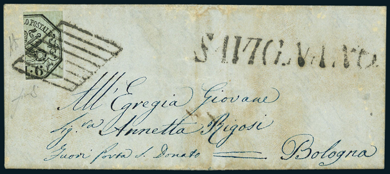 1852, piccola lettera da Savignano dell'agosto 1859 per Bologna, affrancata con una metà del 6 b. grigio verdastro (7), e usato come un 3 b., nitidamente annullato con la griglia in partenza. Cert. Fiecchi.