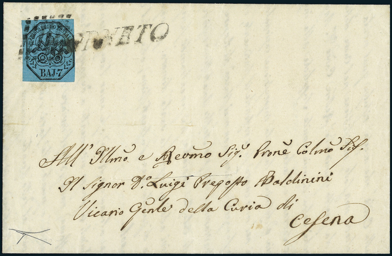 1852, lettera da Corneto del 25 maggio 1855 per Cesena, affrancata con un 7 baj. isolato (8) per pagare la tariffa di primo porto di lettera semplice per l'interno (massima distanza), annullato con lo S.I. in partenza e ribadito col muto a rombi di Civitavecchia in transito. Tagli di disinfezione. Freschissima e rara. Cert. Bottacchi.