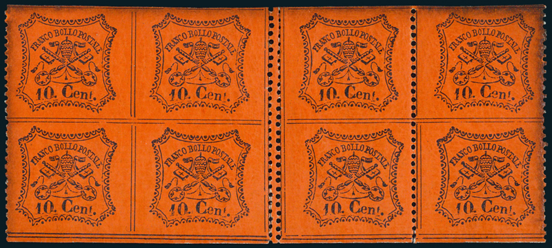 1868, 10 c. vermiglio arancio, blocco di otto con interspazio di gruppo verticale al centro, non dentellato orizzontalmente, e non dentellato verticalmente al centro della quartina di sinistra, con doppia dentellatura verticale al centro dell'interspazio (26h, 26a/I), nuovo con gomma. Lievi ingiallimenti. Raro. Cert. R. Diena.