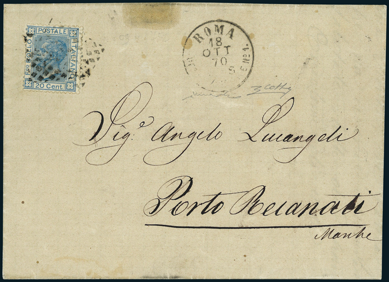 1867, lettera da Roma del 18 ottobre 1870 per Porto Recanti, affrancata con un 20 c. del Regno d'Italia (26), annullato con muto a rombi, con a lato timbro ''Ufficio Succursale N. 1'' del 18 ottobre, che anticipa di sei giorni l'apertura dell'ufficio. La succursale venne aperta ufficialmente al pubblico il 24.10.1870, ma era già funzionante dal 18.10; furono le Poste Italiane, a meno di un mese dall'occupazione di Roma, a creare la prima succursale alla ferrovia necessaria per lo smistamento delle corrispondenze. Molto interessante e rara.