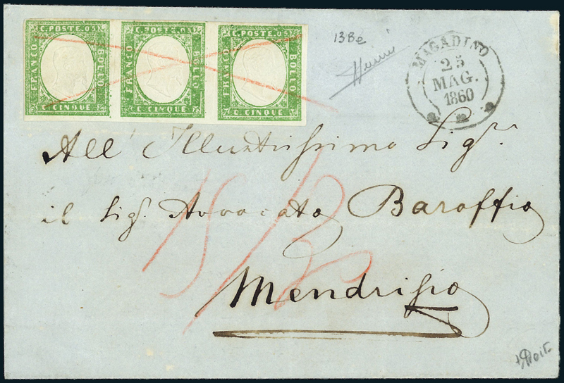 1859, lettera da, probabilmente, località sarda o lombarda del Lago Maggiore, per Mendrisio (Svizzera), affrancata in tariffa di "raggio limitrofo" con 5c. verde giallo (13Be), striscia di tre. Lettera portata in posta a Magadino (Svizzera) anziché in Italia, con l'affrancatura annullata con due tratti di matita rossa delle poste svizzere che non ritennero valida l'affrancatura. Tassata per il doppio della tariffa svizzera di 15 centesimi. Uso eccezionale. Cert. Sorani e Von der Weid.