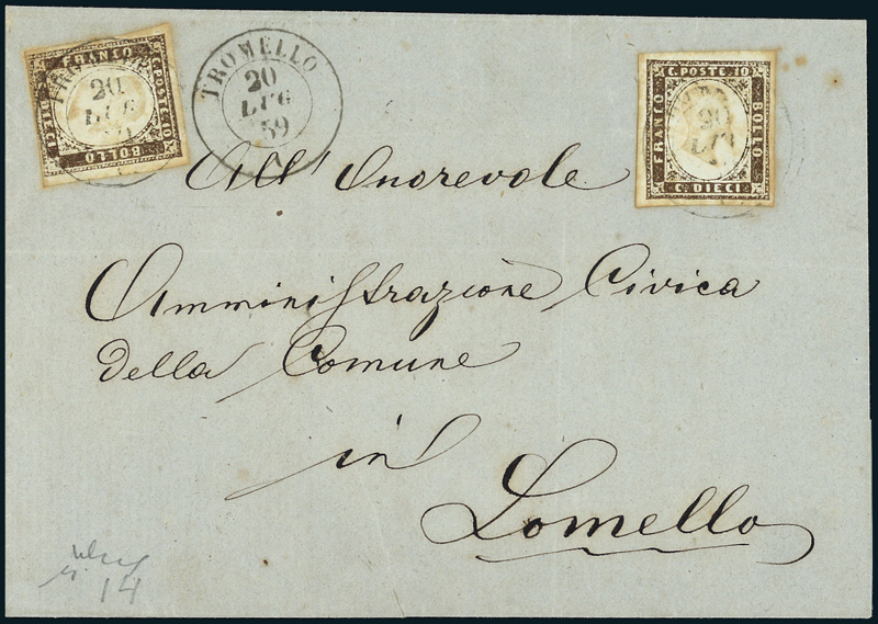 1859, lettera da Tromello del 20 luglio per Lomello, recante due esemplari del 10 c. (14) annullati col doppio cerchio. Rara. Da esaminare. Firmata Chiavarello.
