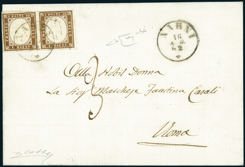 1862, lettera da Narni del 16 agosto 1862 per Roma, affrancata con una coppia del 10 c. di Sardegna (14cl), annullata con il cerchio semplice di Narni (p.R2) Sardo-Italiano. Grande rarità del settore. Freschissima. Cert. Colla, firmato Raybaudi.