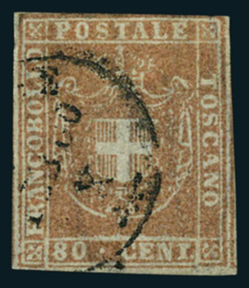 1860, 80 c. camicino (22), esemplare usato con prevalenza di grandi margini.