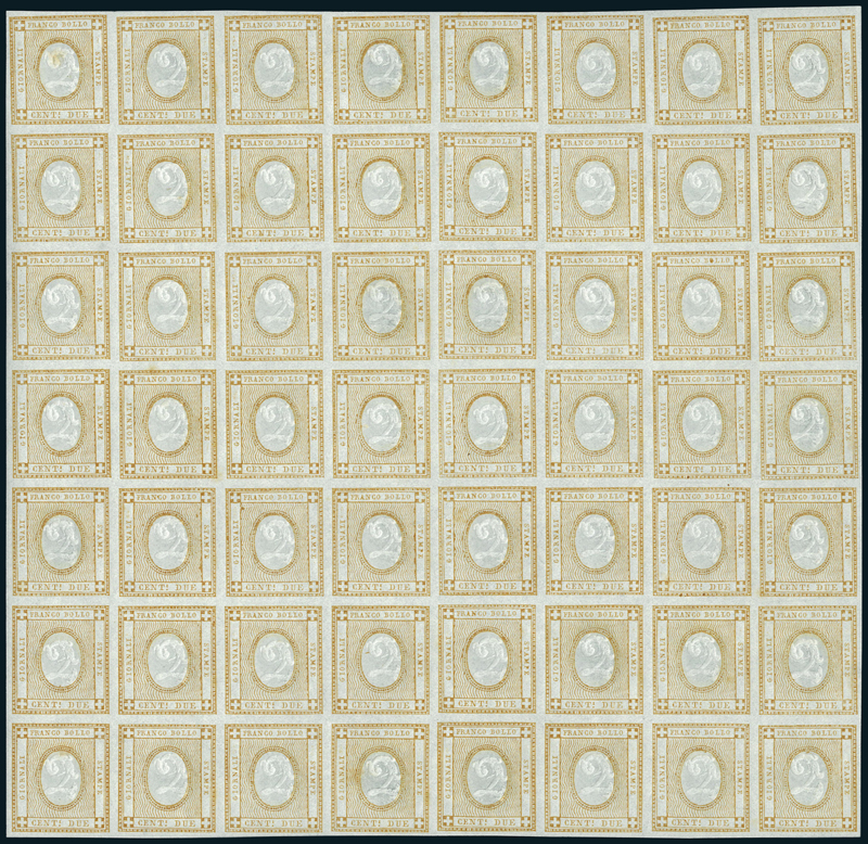 1862, 2 c. bistro bruno (10a), blocco di 56 esemplari, ben marginato e freschissimo, con piena gomma originale. Cert. G. Bolaffi.