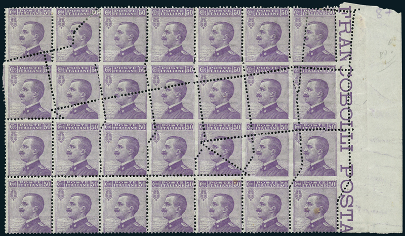 1908, 50 c. violetto (85), blocco di 28 con dentellature spostate e bordo di foglio a destra. Molto raro e spettacolare.