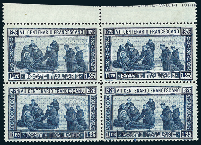 1926, San Francesco, 1,25 l. azzurro, dentellato 13 1/2 (196), blocco di quattro recante bordo di foglio in alto, nuovo con gomma integra, che mostra una buona centratura per questo francobollo. Serie rara e pregevole in ottimo stato di conservazione. Cert. A. Diena.