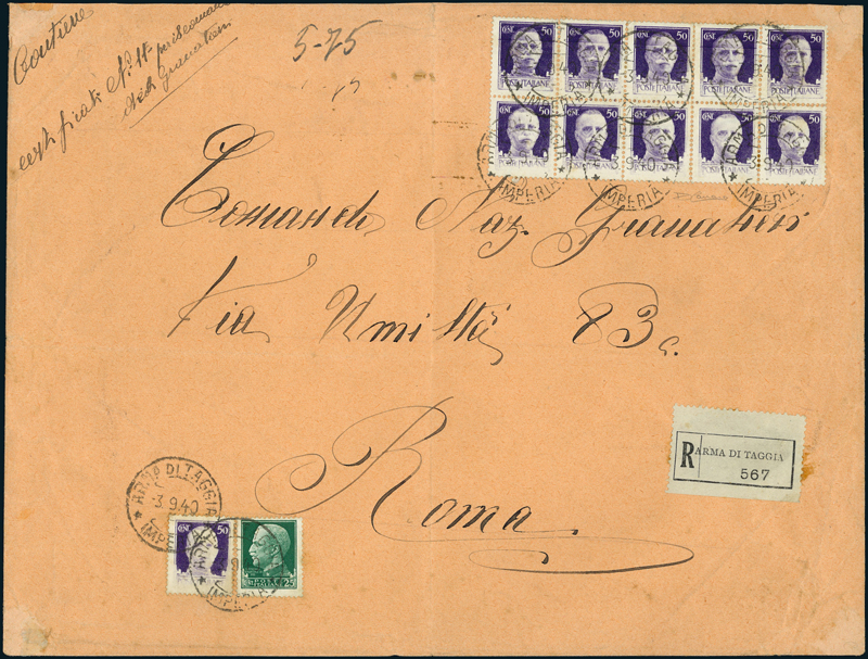 1929-40, busta raccomandata da Arma di Taggia del 3.9.40 per Roma, recante 25c. (248), e blocco di dieci e singolo del 50 c. con stampa evanescente (251b, senza prezzo come usato nel Sassone). Affrancatura rara non filatelica. Cert. Carraro.