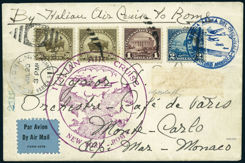 1933, Crociera Nord Atlantica, Volo di Ritorno, insieme composto da tre aerogrammi da Chicago (2) e Nuova York del 18 e 23 luglio per Roma, Ohio e Montecarlo, con affrancature statunitensi e bolli diversi "Italian Air Cruise" Chicago-Roma, New York-Roma e Chicago-New York. Cert. A. Diena, G. Bolaffi ed A. Bolaffi.
