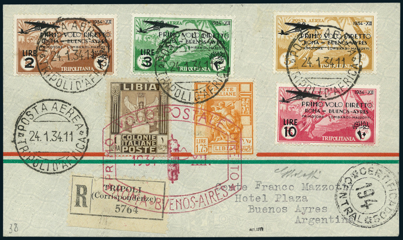 1934, Primo Volo Diretto Roma-Buenos Aires, le tre serie complete di posta aerea, ognuna composta da quattro valori, di Regno (56-59), Cirenaica (20-23) e Tripolitania (30-33), applicate su tre aerogrammi con il timbro speciale del volo e affrancature complementari. Insieme non comune. Cert. G. Bolaffi.