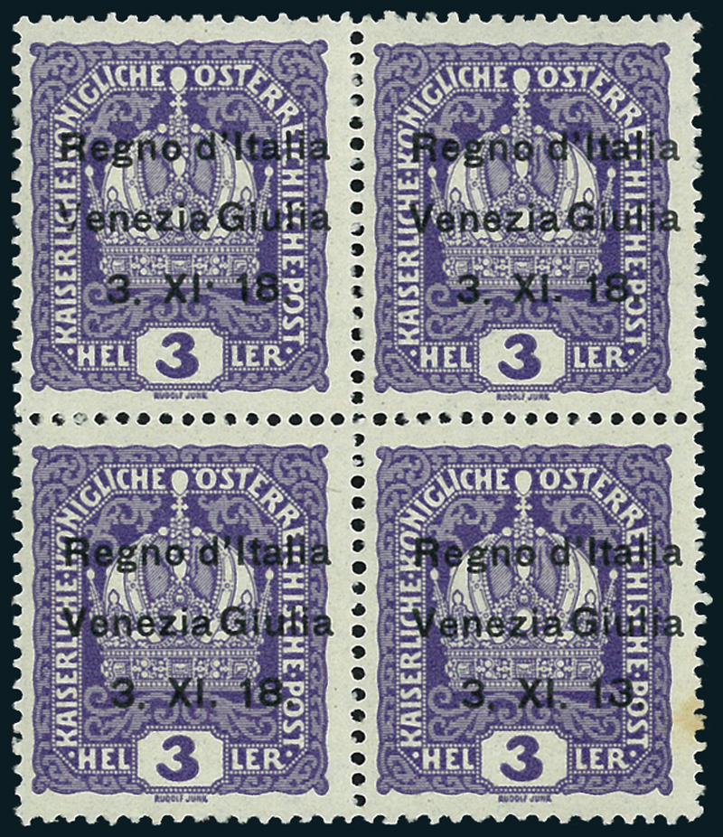 1918, 3 h. violetto (1), blocco di quattro, con il primo esemplare in alto a sinistra, mostrante il punto centrale del datario in alto (1wa), nuovo con gomma integra. Varietà rara. Cert. Sorani.