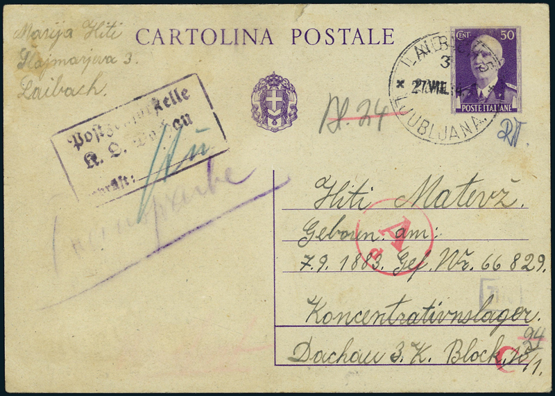1944, intero postale (piccolo strappo in alto) di Regno di 50 c. da Lubiana del 27.7.44 per il campo di concentramento di Dachau, con censure tedesche di Monaco ed in arrivo "Postzensurstelle/K. L. Dachau/geprüft__". Uso straordinariamente raro, probabilmente unico, di documento postale per un campo di concentramento tedesco da uno dei territori occupati dalla Germania nei Balcani.