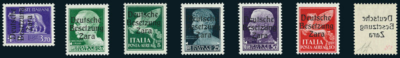 1943, 3,70 l. violetto (14), 20 l. verde giallo (17), 25 l. nero azzurro (18) e 50 l. violetto (19), i quattro valori più importanti della prima serie; 5 l. verde (7) e 10 l. carminio (8), l'ultimo con decalco al verso, i due francobolli più pregiati di posta aerea. Tutti nuovi con gomma integra e molto freschi. Insieme rarissimo e di grande fascino, comprendente valori chiave di Zara. Cert. A. Diena per i valori da 20 a 50 l., ed il 10 l. di posta aerea, il 3,70 l. è firmato A. Diena.