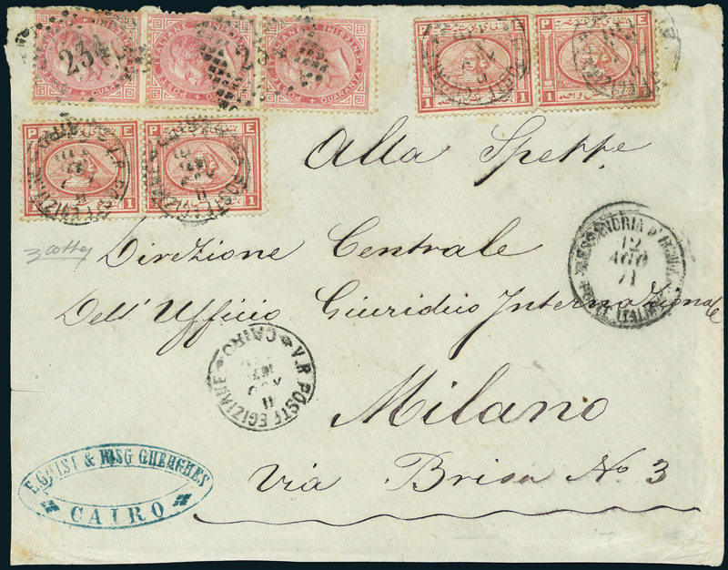 1863, frontespizio dal Cairo del 11.8.1871 per Milano, recante affrancatura mista composta da Egitto 1867-69 1 pi. rossa, quattro esemplari annullati con c.s. "V.R. Poste Egiziane/Cairo", e Regno 40 c. rosa carminio (L20), striscia di tre, col numerale a punti "234" dell'ufficio di Alessandria. Rarissima affrancatura mista con quattro porti egiziani e tre italiani. Cert. Colla.