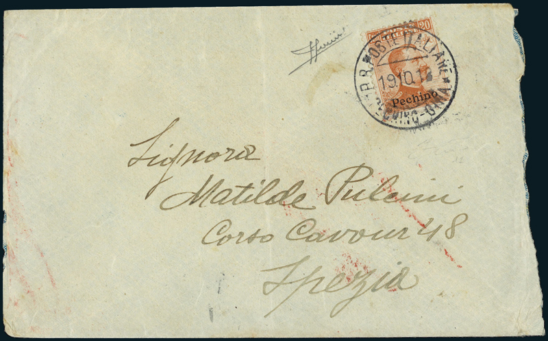 Uffici Postali in Cina. 1918, 19 settembre. Lettera per La Spezia affrancata con 20 c. "Pechino" (12), annullato con bell'impronta del bollo "R.R. Poste Italiane/Pechino-Cina". Rara ed ancora non quotata su lettera. Cert. Sorani.