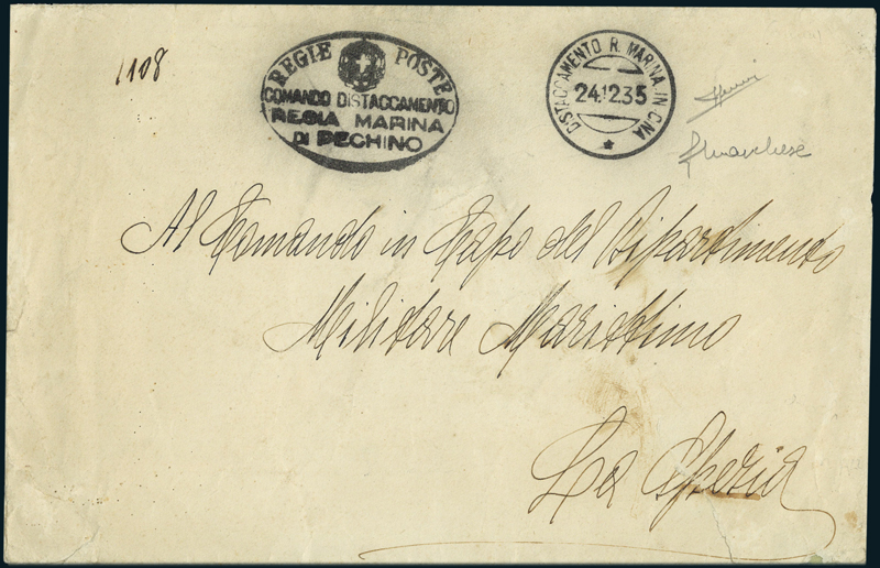1935, 24 dicembre. Busta di servizio spedita in franchigia da Pechino a La Spezia, recante timbro a data "Distaccamento R. Marina in Cina", accompagnato dal bollo ovale di franchigia con stemma "Regie Poste/Comando Distaccamento/Regia marina/Pechino"- Al verso, timbro azzurro con stemma sabaudo "Distaccamento R. Marina Pechino" ed arrivo. Nota di G. Marchese: "L'uso del bollo di franchigia, il numero distintivo manoscritto, fanno presumere l'invio in bolgetta diplomatica, affidata a nave militare che si recava in Italia. L'uso di questo tipo di bollo, alquanto raro, fa ritenere che sia stato usato adoperato solo a Pechino nell'arco di tempo di circa un decennio, quando a Pechino erano rimasti pochi uomini per compiti ristretti". Rarissima, impreziosita da timbri di bellissima qualità. Cert. Marchese e Sorani.
