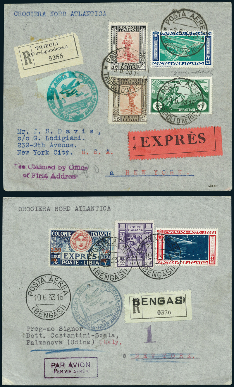 1933, Crociera Nord Atlantica Balbo, due aerogrammi per New York, di cui uno da Bengasi del 10 giugno con un 44,75 l. di posta aerea di Cirenaica (19), con affrancatura complementare di Libia; l'altro venne spedito da Tripoli il 9 giugno ed affrancato con un 44,75 l. di posta aerea di Tripolitania (29) più tre francobolli complementari di Libia e Tripolitania. Cert. A. e G. Bolaffi.