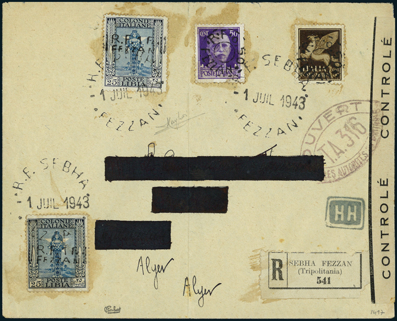 1943, raccomandata da Sebha del 1° luglio per Algeri, affrancata con 0,50 su 50 c. (11), 1 f. su 25 c. (12) e posta aerea 50 c. (3), con censura. Rara. Firmata Calves.