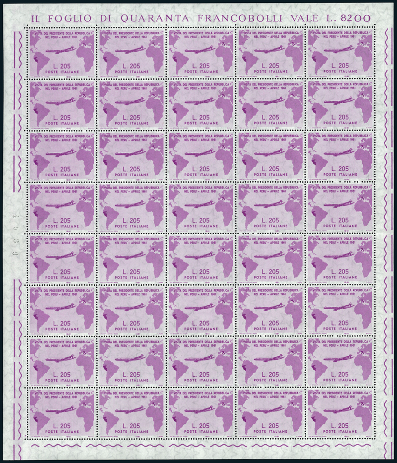 1961, "Gronchi Rosa", 205 l. lilla rosa (921), foglio completo di 40 esemplari con gomma integra, recante margini esterni del foglio su tutti i lati, con la scritta in alto "Il Foglio di Quaranta Francobolli Vale L.8200". Eccezionale e splendido.