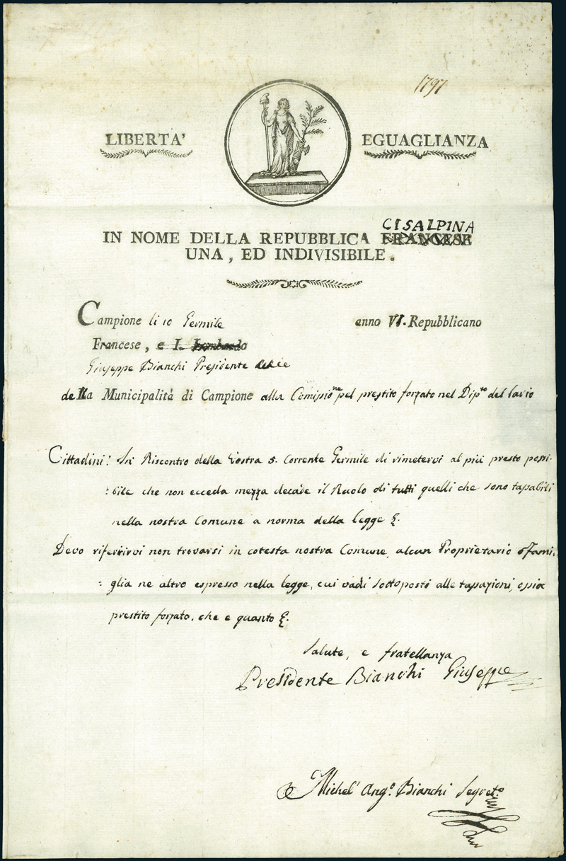 1797, lettera per Como, con illustrazione della Repubblica Cisalpina. Rarissimo precursore della collezione di Campione d'Italia.
