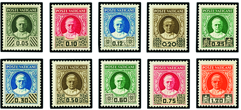1935, serie di dieci saggi con gomma originale, ottenuti incollando sulla parte inferiore di esemplari della serie di 1929 dei frammenti di carta opportunamente sagomati e recanti le stampe del nuovo valore e di ornati che ricropono il valore precedente. I saggi vennero allestiti nel 1935 ad iniziativa dell'allora consulente filatelico delle Poste Vaticane, Dott. Luigi Vitali, il quale propose l'emissione di una seconda serie "provvisoria" dopo quella del 1934. Cert. Enzo Diena e Raybaudi.