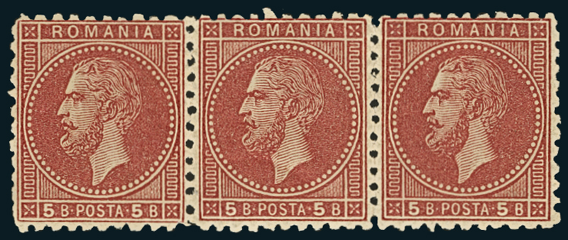 1879, 5b. carmine instead of green, ERROR OF COLOUR, strip of three in a rich dark shade, entirely preserving its original gum. Few slightly short perforations, as usually encountered, are of no consideration. An exceedingly scarce and most desirable multiple. Mi. 50 F = € 1'350+ (for mounted examples).