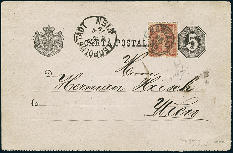 1879, Sept. 28. 5b. black, postal stationery card from Turnu Severin to Vienna, additionally franked with Second Bucharest print 5b. carmine instead of green, ERROR OF COLOUR, tied by "T. Severin" c.d.s., showing arrival alongside. The error was caused by a cliché of 5b. in the plate of 10b.; the postal authorities considered this stamp to represent the 10b. denomination and a postal rate of 15b. was intended in this case. (A similar card from the same "Hirsch" correspondence, but bearing a 10b. denomination, is included for comparison). Only two examples of this significant rarity on an entire are known. Cert. Bloch, signed Holcombe (with additional statement: "2 known" in manuscript). Mi. 50 F.