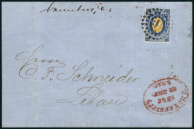 1858, 20k. blue and orange, printed on thin paper, a very fresh and fine example boasting a magnificent embossing, on double weight letter, dated 27 April 1858, to Libau, with the stamp being cleanly tied by "1" numeral dotted cancel with matching red St. Petersburg oval datestamp at bottom right. One of the finest covers known bearing the third stamp of Russia (as stated by the renowned expert Zbigniew S. Mikulski in his certificate), this being a very rare and desirable single franking, of fundamental importance in the advanced collection of Russia. Cert. Mikulski. Mi. 3y.