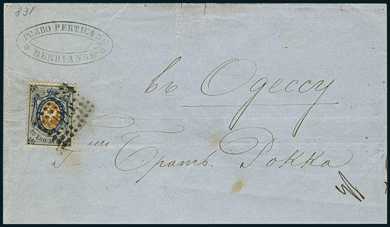 1858, 20k. blue, group of one cover dated November 14, 1860 to Odessa, bearing single franking of this value (horizontal crease) tied by dotted square, as well as three stamps in two different shades including one elusive cancellation in blue. A very scarce and difficult assembly. Cert. Enzo Diena. Mi. 3.