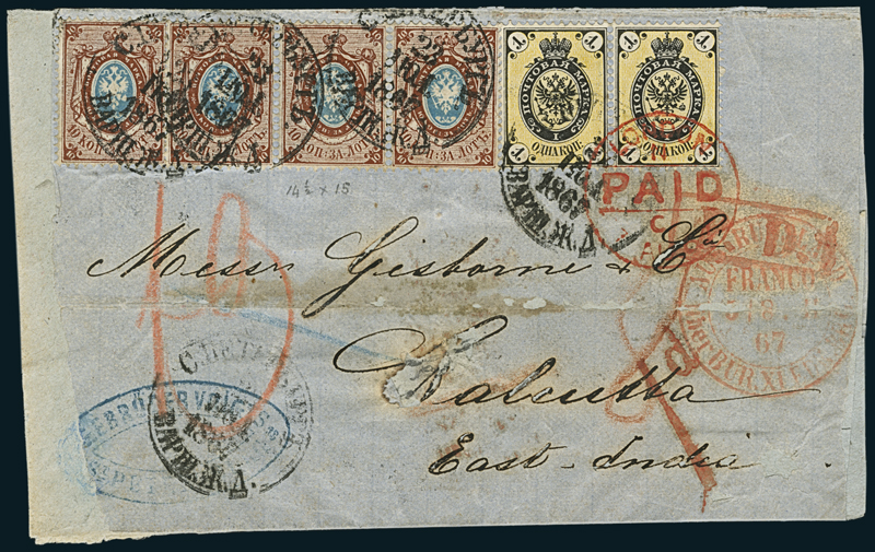 1867, July 23. Cover from St. Petersburg to Calcutta (India), bearing 1866 1k. black and yellow (2) and 10k. reddish brown and blue (4), tied by c.d.s.'s on dispatch, carried via Prussia following transmission by British packet to destination, with red Eydkuhnen-Bromberg "Franco c.d.s. and red crayon "9" Sgr. credited to Prussia, with red "London/Paid" c.d.s. also tying the franking, and "1d" British packet rate, backstamped in Bombay and Calcutta. Letter with side flaps lacking and small portions of paper missing on front, with paper being added to improve appearance. One of the most desirable outgoing mails of Imperial Russia, with only three covers recorded in the classic period to this destination -all being carried through different routes-. SC 17, 20.