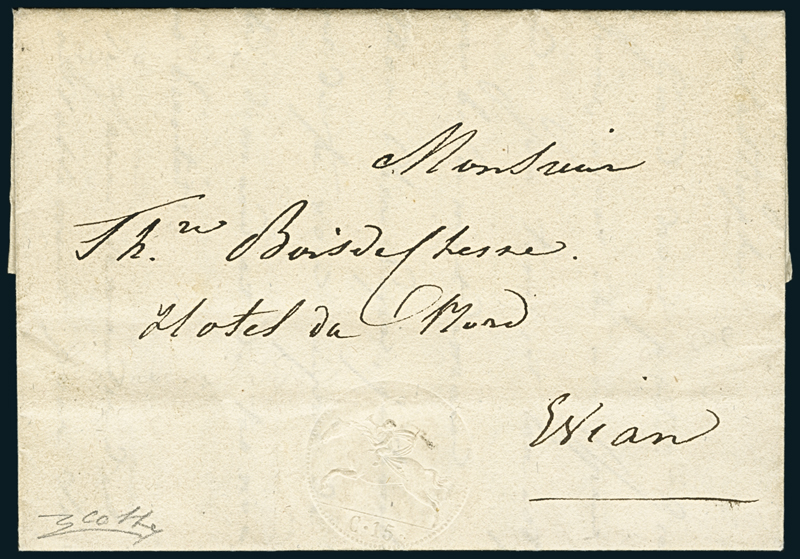 1827, August 1. Entire letter from Geneva to Evian (then in Kingdom of Sardinia), exhibiting -strong- 15 centesimi "Cavallino" embossing (Sassone 4), accepted on dispatch, which paid the portion of the journey in Sardinian territory. An extraordinary and unique rarity which, to our knowledge, is the only known example of a forerunner usage in Switzerland prior to the issue of the first postage stamps, further enhanced by being the only recorded "Cavallino" used abroad. Cert. Colla.