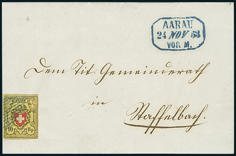 1850-51, 10 Rp. Rayon II gelb, ohne KE, T. 10 E LU, sauber gestempelt mit blauer Raute auf Brief von Aarau nach Staffelbach adressiert (Attest Renggli); auch Rayon I ohne KE zus. mit Rayon III 15 Rp. kleine Wertziffer auf Chargé-Brief von Erlach nach Bern. SBK 16II, 17II, 18.