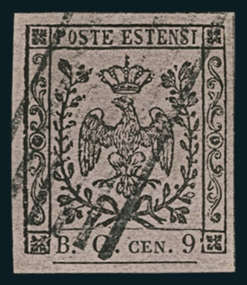 1853, segnatasse per giornali, 9 c. violetto griglio (1), margini ampi e bilanciati, leggermente annullato con il disegno dell'aquilla molto visibile. Molto bello. Cert. A Diena.