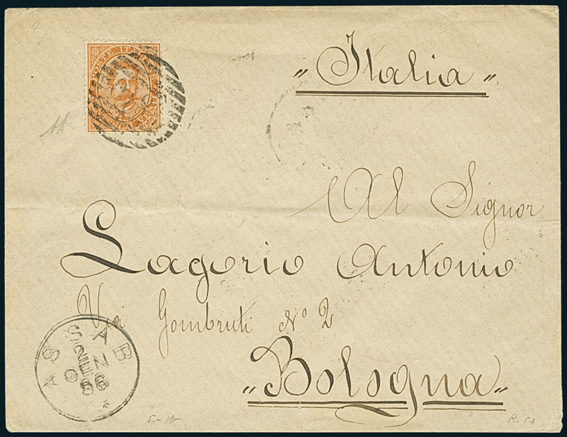 1886-88, due buste, una per Bologna, l’altra per Piacenza, entrambe affrancate con 20c. di Umberto I e annullati col numerale “3840”, con a lato il bollo a cerchio e stella (p. 8). Bolli di transito e arrivo al verso.