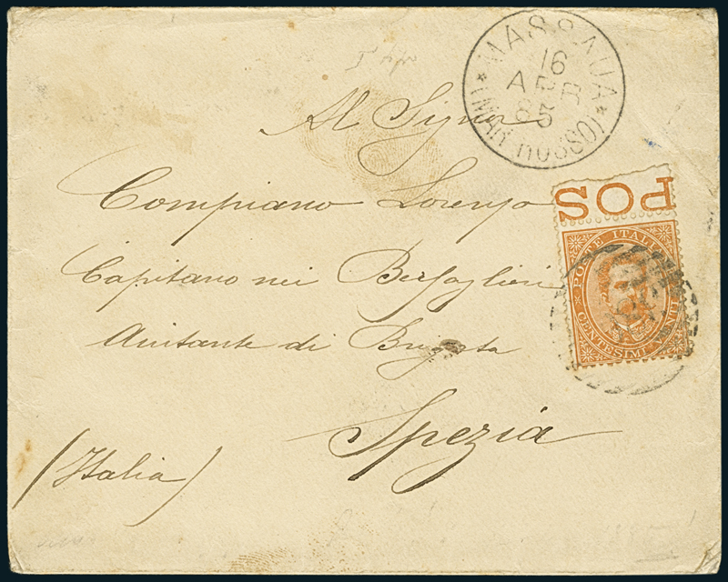 1885, busta del 16 aprile per Spezia, affrancata con 20c. di Umberto I, annullato col numerale a sbarre “3862”, con a lato il cerchio “Massaua/(Mar Rosso)” 1° tipo (p.7). Bollo di Brindisi in transito al verso. Una delle prime date note dell’utilizzo di queste impronte. Rara.