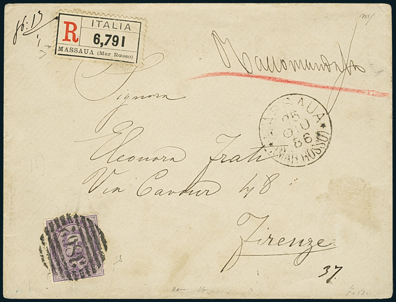 1886, raccomandata del 25 giugno per Firenze, affrancata con 50c. di Umberto I, annullato col numerale a sbarre “3862”, con a lato il bollo a cerchio “Massaua/(Mar Rosso)” 1° tipo (p.7). Etichetta “Massaua/(Mar Rosso)”. Rara.