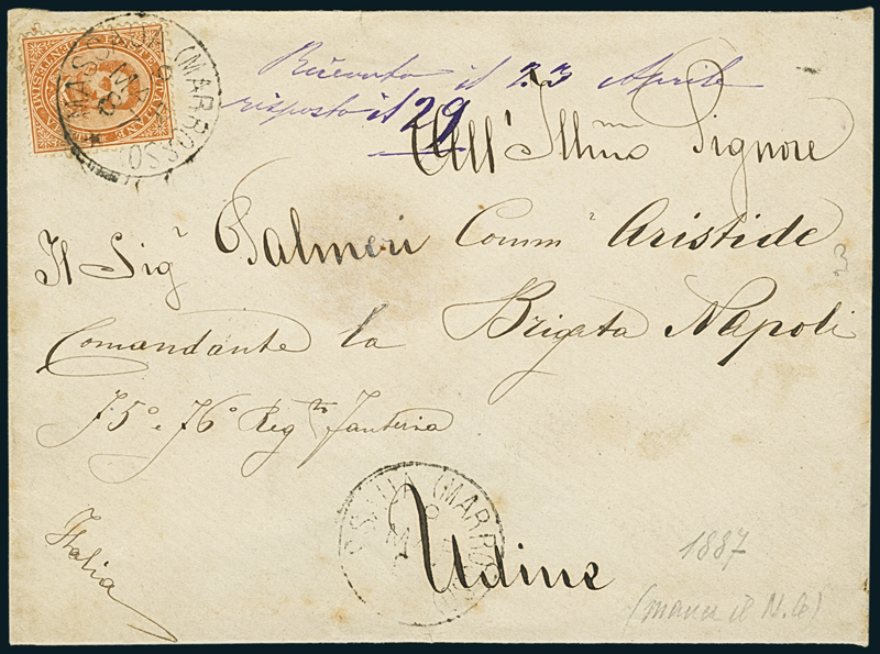 1886-87, due buste affrancate con 20c. di Umberto I: una per Sassari annullata col numerale a sbarre “3862” ed a lato il bollo a cerchio del 2° tipo (p. 8), l’altra annullata con lo stesso annullamento “Massaua/(Mar Rosso)”. Rara combinazione.