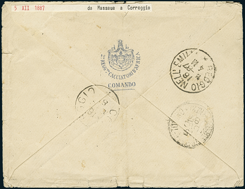 1887, due buste affrancate con 20c. di Umberto I: una del giugno diretta a Massaua dall’Italia (provenienza poco leggibile) con bollo di arrivo al verso “Massaua/(Mar Rosso)” 2° tipo (p. 8); altra da Massaua del dicembre per Correggio (RE), recante al verso il simbolo a stampa del Comando 2° Reggimento Cacciatori d’Africa. Molto interessante.