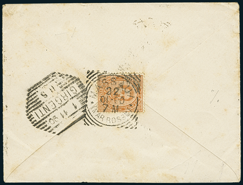 1890, busta da Massaua del 22 ottobre per Girgenti, affrancata al verso con 20c. di Umberto I, annullato col bollo a cerchio e lunette, data e ora. Al recto bollo a cerchio “Massaua/Mar Rosso” 3° tipo (p. 7). Bollo ambulante di Girgenti al verso del 1 novembre. Rara combinazione.