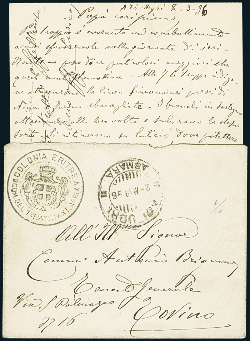 COLONIA ERITREA/COM. DEL 1° BATT. FANT. AFRI. Bollo di franchigia militare in azzurrastro con stemma al centro, su busta con a lato il bollo “Adi Ugri/Asmara – 2 marzo 1896” (p. 13) per Torino. Nel testo, un ufficiale racconta al padre una breve cronaca della battaglia di Adua, svoltasi il giorno precedente: “Adi-Ugri 2-3-96 - Papà carissimo, purtroppo è avvenuto un combattimento assai sfavorevole nella giornata di ieri. Non ti posso dare particolari maggiori che questi avuti stamattina. Alle 7 le truppe indigene attaccarono la linea Scioana nei pressi di Adua e furono sbaragliate. I bianchi in sostegno attaccarono alla loro volta e subirono la stessa sorte. Si ritirarono a Entisciò dove potettero sostenere un altro attacco dei Scioani e ritirarsi su Saganeiti e Coatit. Circa la nostra sorte non ne sappiamo nulla. Il fatto che se si tratta di resistere col Forte siamo in condizioni ottime e su questa strada possiamo fare argine se non ci girano. Tolto il dispiacere dei nostri caduti e della sconfitta il nostro morale è alto e non disperiamo di rimetterci. Volevo telegrafarti, ma temevo metterti in maggiori pensieri sul mio conto. Pare che i nostri abbiano venduto cara la vita e che gli Scioani abbiano avuto delle perdite considerevoli. Raccomando a mamma di non stare in pensiero per me che sono come in una cassa forte. Abbraccia affettuosamente tutti, tuo aff. Enrico”. Straordinario documento storico postale, unico.