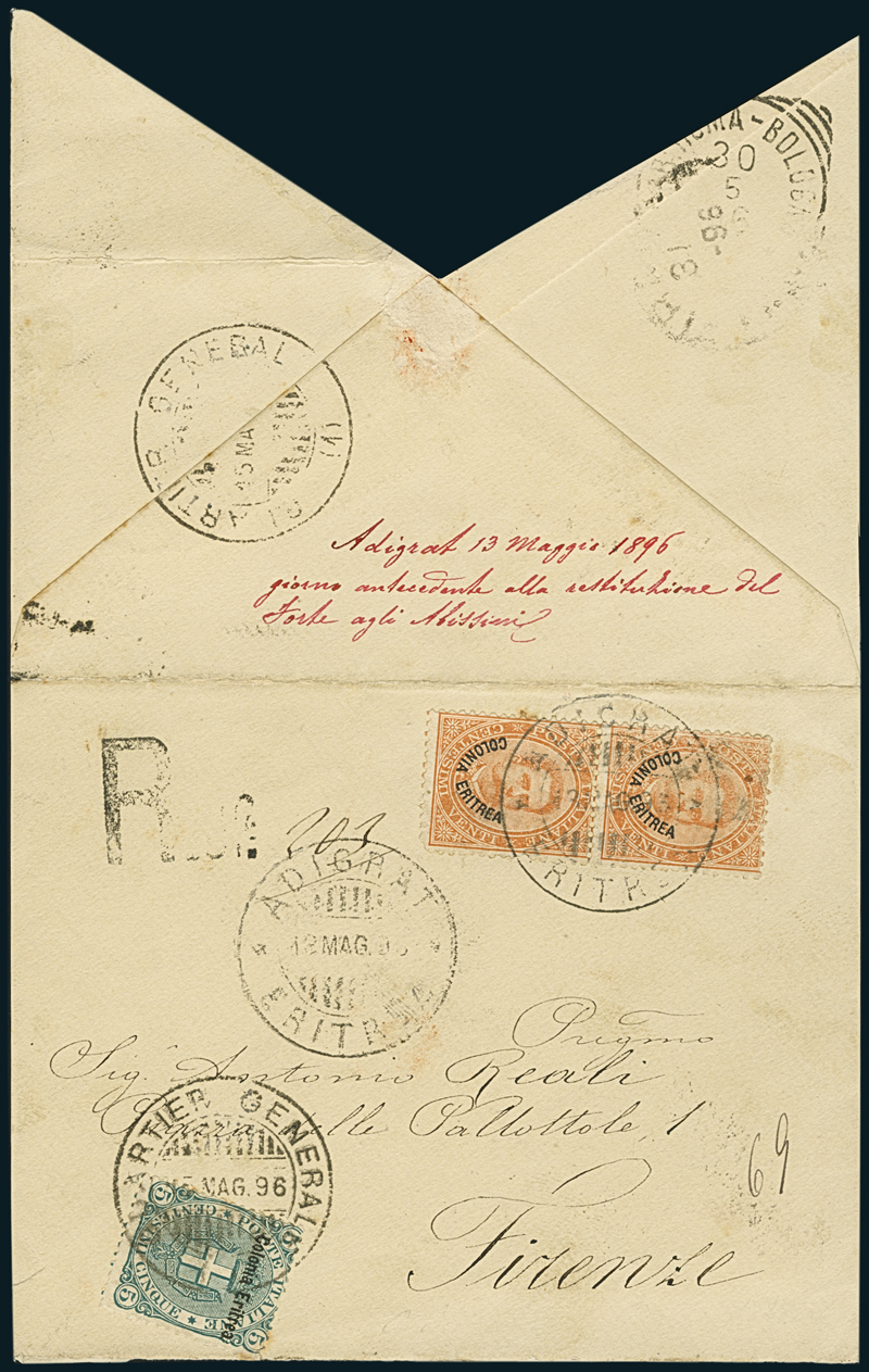QUARTIER GENERALE (1). Raccomandata per Torino affrancata con 5c. e coppia del 20c. (3, 5), il primo annullato col timbro di P.M. del 15 maggio 1896 (p. R) ripetuto anche al verso, la coppia dal timbro “Adigrat/Eritrea – 13 maggio 1896” (p. 13). Straordinario e unico documento, di ottima qualità.